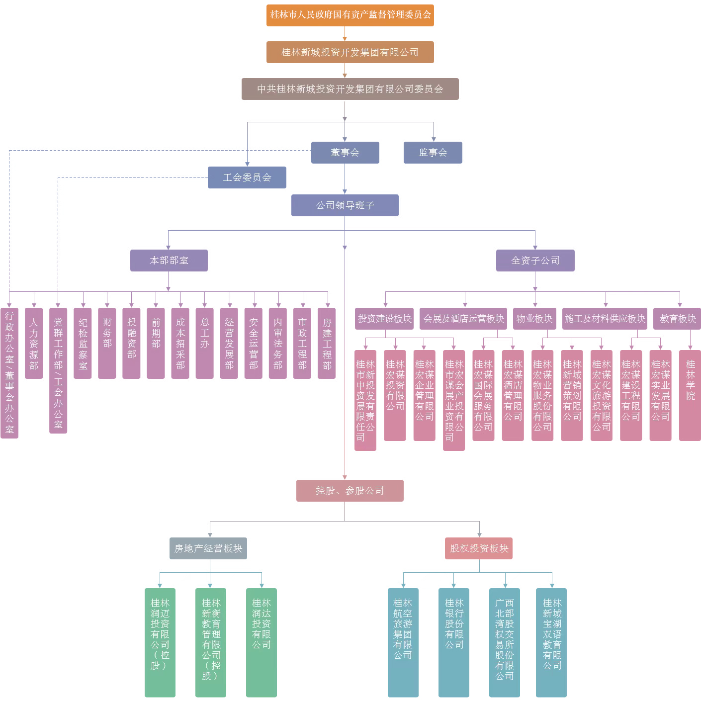 公司下設(shè)12個全資子公司,分為五大板塊,其中(一)投資建設(shè)板塊:桂林市新中投資發(fā)展有限責任公司、桂林宏謀投資有限公司、桂林宏謀企業(yè)管理有限公司、桂林市宏謀會展產(chǎn)業(yè)投資有限公司;(二)會展及酒店運營板塊:桂林宏謀國際會展服務(wù)有限公司、桂林宏謀酒店管理有限公司;(三)物業(yè)板塊:桂林宏謀物業(yè)服務(wù)股份有限公司、桂林新城營銷策劃有限公司、桂林宏謀文化旅游投資有限公司;(四)施工及材料供應(yīng)板塊:桂林宏謀建設(shè)工程有限公司、桂林宏謀實業(yè)發(fā)展有限公司;(五)教育板塊:桂林學院。