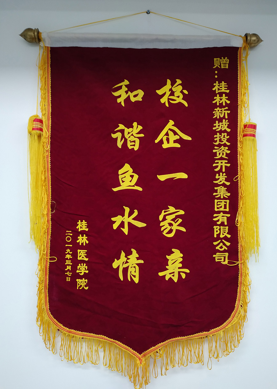 圖為桂林醫(yī)學院院長助理覃克強一行向新城投資集團贈送錦旗