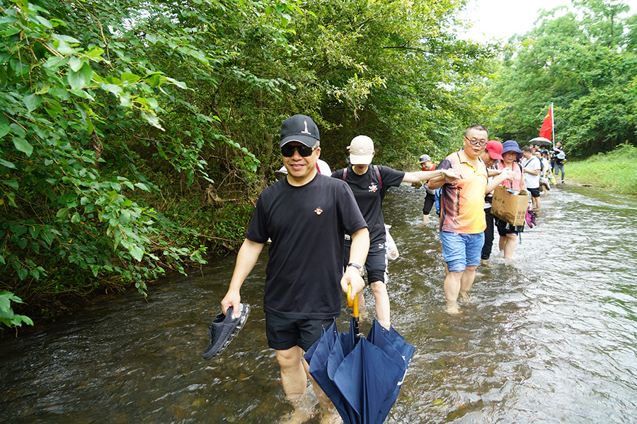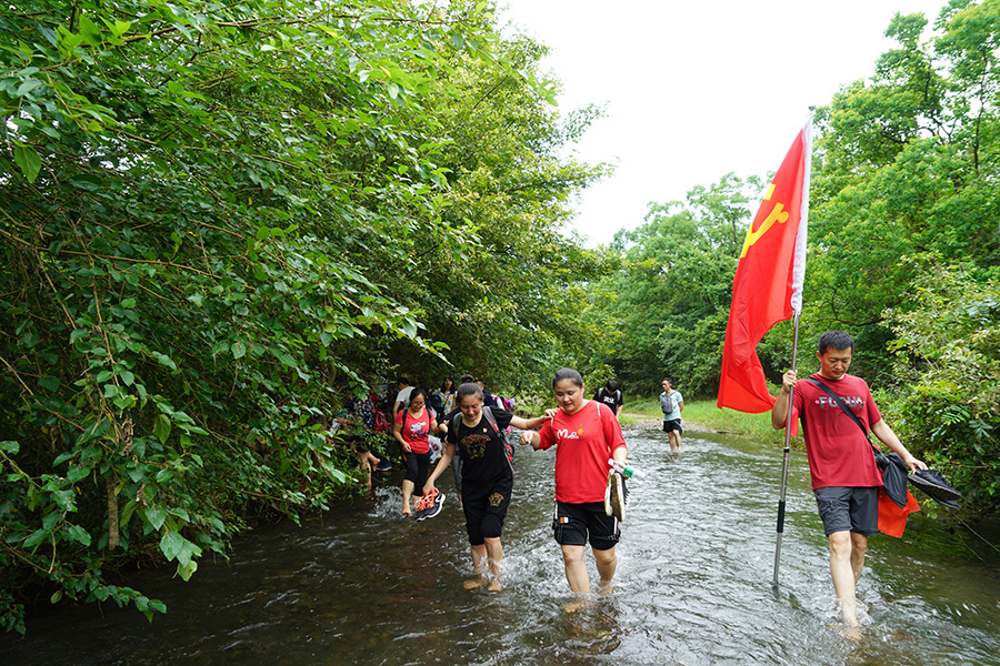 大雨過后,烈日當(dāng)空,地表溫度迅速上升,空氣中的水蒸氣增多,汗液難于蒸發(fā),面對濕熱天氣,大家義無反顧的前進(jìn),衣服濕了又干,干了又濕。中午14點(diǎn),隊(duì)伍進(jìn)入一片樹林,起初地勢較為平坦、道路開闊……漸漸地,地面開始凹凸不平,有了越來越多的水坑,道路開始變窄,一條小溪攔住了隊(duì)伍。大家紛紛脫鞋下水,手拉著手、攙扶著后面的同志在溪水中行進(jìn),本著不能讓任何一個(gè)同志掉隊(duì)的信念,整個(gè)團(tuán)隊(duì)相互鼓勁、相互扶持,克服困難,攜手踏過這段溪流。