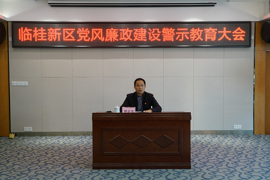 會上,羅正寶領學了《國有企業(yè)領導干部廉潔自律有關規(guī)定》,講解了《中國共產黨問責條例》。他指出,臨桂新區(qū)黨風廉政建設警示教育大會的召開,是開展“不忘初心、牢記使命”主題教育的重要一環(huán)。國有企業(yè)廣大黨員干部要按照主題教育“清正廉潔作表率”的目標要求,把加強紀律作風建設工作擺在重要位置,進一步加強黨風廉政建設,堅持依規(guī)用權,帶頭接受監(jiān)督,嚴格按照民主集中制和“三重一大”議事規(guī)則來議事、來決策、來辦事。要進一步強化廉潔意識,嚴格修身自律,守好人生、家庭和事業(yè)的“底線”, 著力錘煉忠誠干凈擔當的政治品格,不斷開創(chuàng)臨桂新區(qū)全面從嚴治黨和黨風廉政建設新局面。