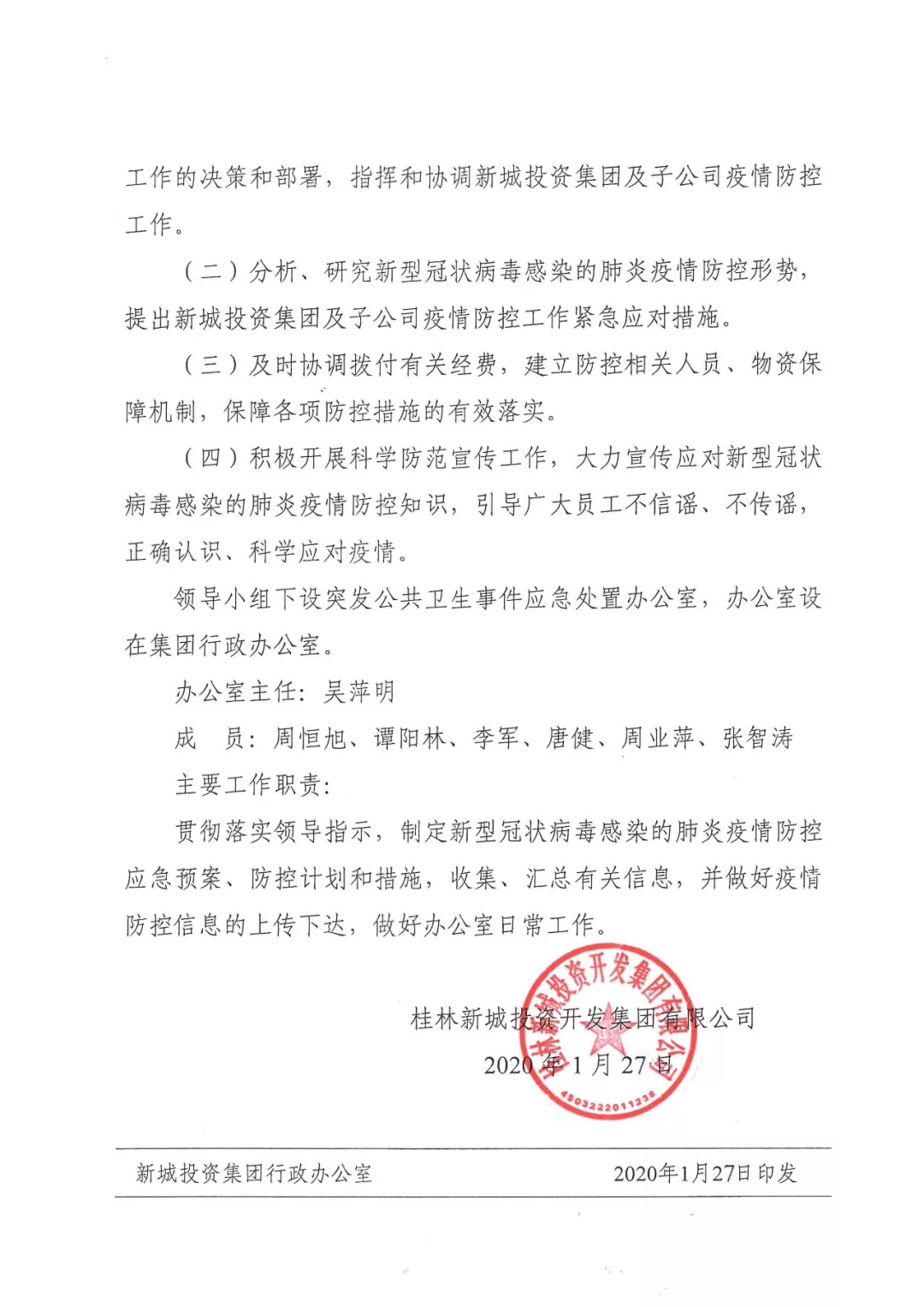 新城投資集團上下立即行動起來,堅決貫徹落實黨中央的決策部署以及省、市委市政府相關(guān)要求,成立了突發(fā)公共衛(wèi)生事件應(yīng)急工作領(lǐng)導(dǎo)小組,統(tǒng)籌協(xié)調(diào)相關(guān)工作。集團黨支部結(jié)合實際,組織全體職工特別是黨員采取切實有效措施開展防控,抓好疫情防控工作,堅決遏制疫情蔓延勢頭。
