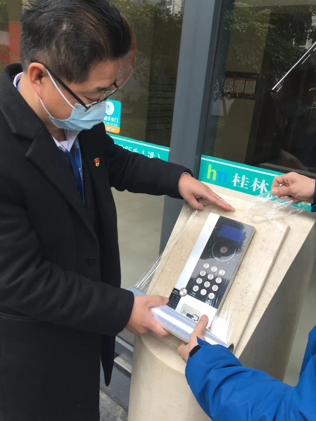 工程部在其部門(mén)負(fù)責(zé)人、共產(chǎn)黨員周成同志的帶領(lǐng)下,全員提前返崗。通過(guò)給小區(qū)所有入戶門(mén)對(duì)講系統(tǒng)及電梯內(nèi)按鍵穿上每天一換的保鮮膜“保護(hù)外套”、給每臺(tái)電梯內(nèi)裝上業(yè)主按鍵時(shí)使用的抽紙等方法,最大程度減少接觸病菌細(xì)菌的幾率,不留隱患,給業(yè)主創(chuàng)造一個(gè)健康、 安心的居家環(huán)境,為所有業(yè)主守住這道防疫防線。