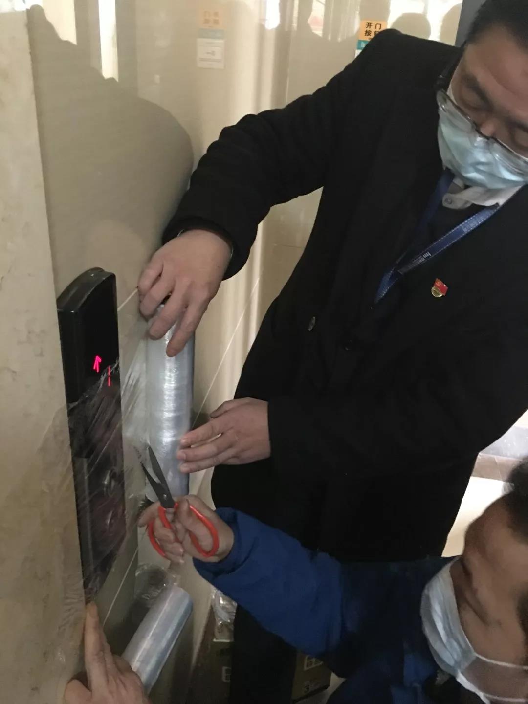 ▲周成同志與同事正在給入戶門(mén)對(duì)講系統(tǒng)及電梯按鍵貼上保鮮膜。