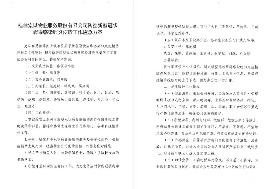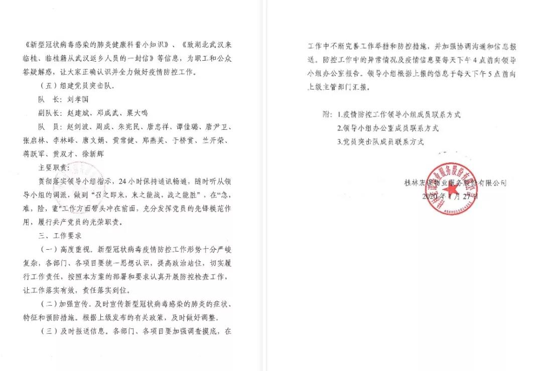 一、為認真貫徹落實上級單位關于新型冠狀病毒感染肺炎疫情防控相關文件精神,將疫情防控工作落到實處,宏謀物業(yè)制定《桂林宏謀物業(yè)服務股份有限公司防控新型冠狀病毒感染肺炎疫情工作應急方案》,成立疫情防控工作領導小組,以便統(tǒng)籌指揮協(xié)調相關工作。同時成立以總經理劉孝國同志任隊長的物業(yè)公司黨員突擊隊,在“急,難,險,重"等工作面前,黨員同志帶頭沖在前面,充分發(fā)揮黨員的先鋒模范作用,履行共產黨員的光榮職責。