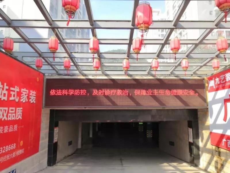 ▲新城國奧小區(qū)項目利用LED屏幕宣傳防疫信息。并對出入門把手、電梯按鍵、兒童娛樂設施等消毒。