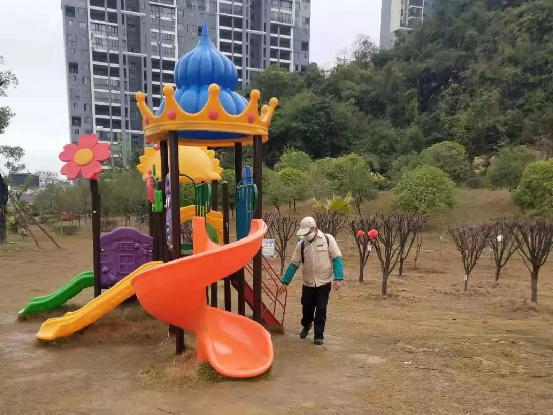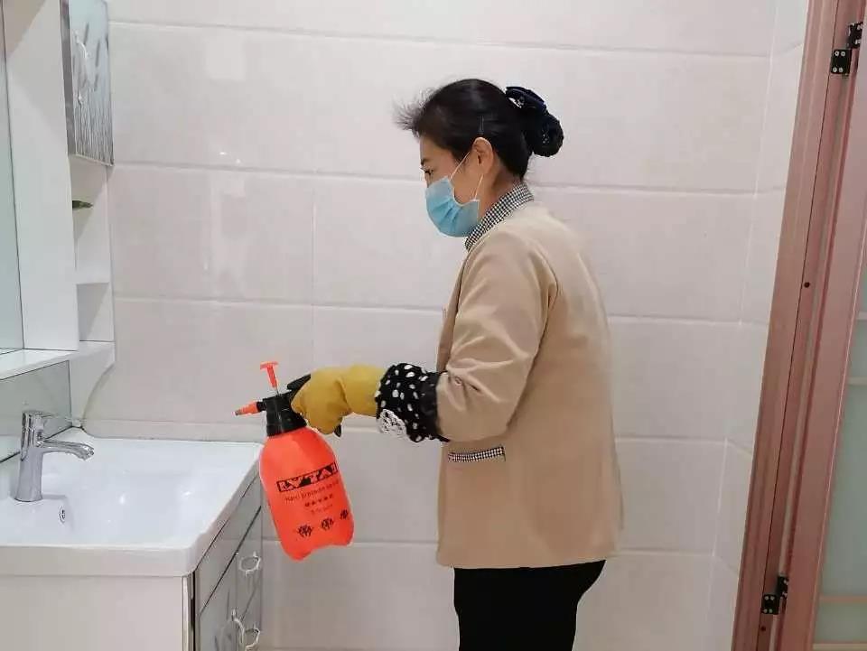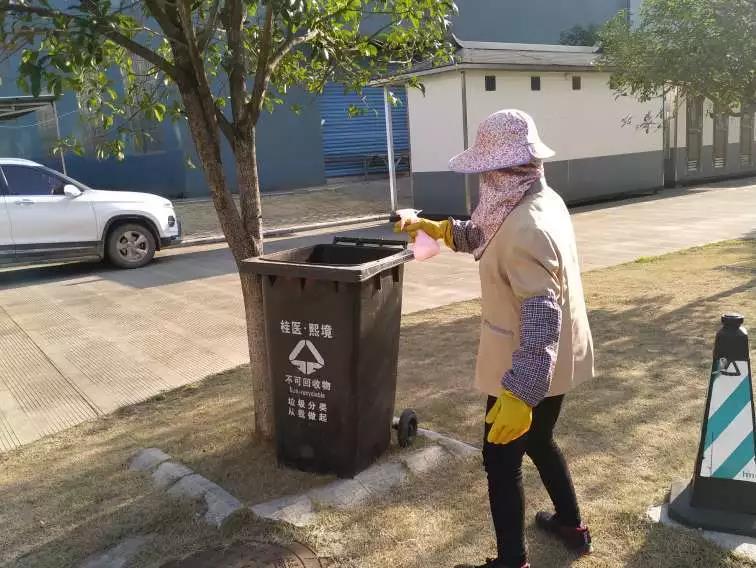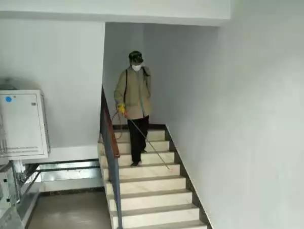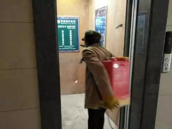 ▲桂醫(yī)·熙境項目對電梯、單元樓大廳、客服中心等地噴灑消毒水。