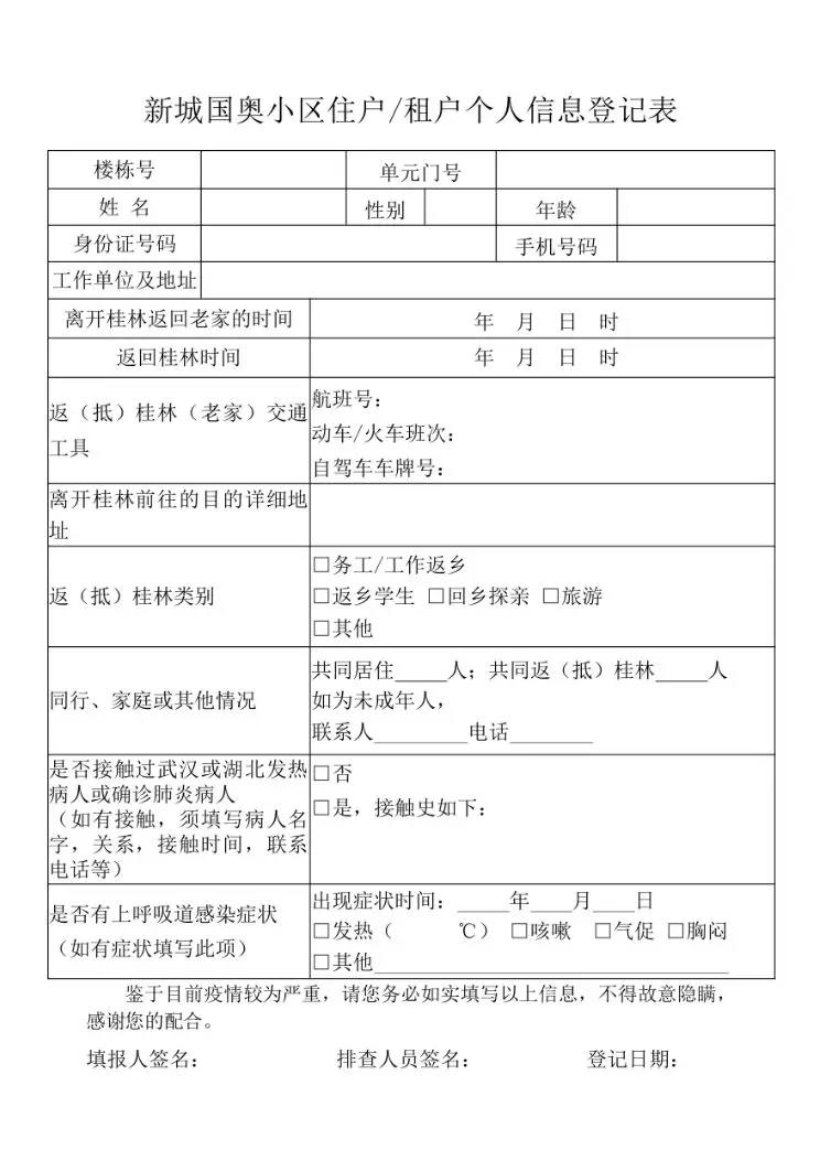 “您好!根據(jù)臨桂區(qū)疫情防控指揮部及新區(qū)管委會(huì)的要求,為切實(shí)做好疫情防控工作,杜絕在本小區(qū)內(nèi)發(fā)現(xiàn)疫情隱患,我們將對(duì)小區(qū)內(nèi)所有的住戶進(jìn)行逐一排查,請(qǐng)您配合我們填寫(xiě)《新城國(guó)奧小區(qū)住戶/租戶個(gè)人信息登記表》。”