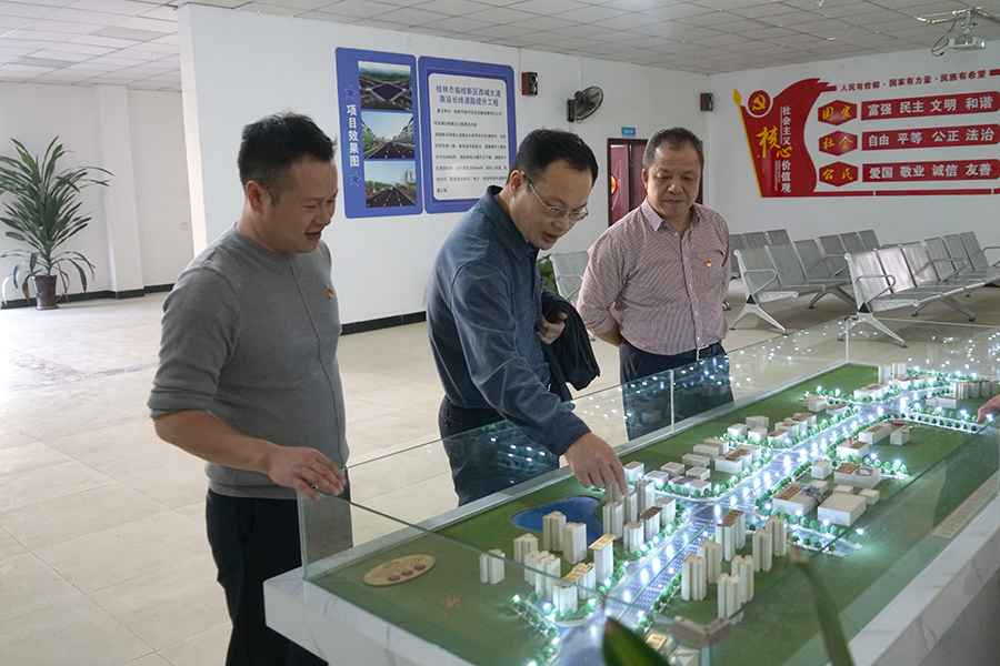 11月18日下午,臨桂新區(qū)工委委員、管委會副主任蔣玖明一行到西城大道南延長線道路提升工程項目現(xiàn)場調(diào)研,指導西城大道南延長線項目聯(lián)合黨支部黨建工作。臨桂新區(qū)工委組織人事部部長、創(chuàng)建領導小組辦公室主任梁利,新區(qū)黨總支委員、創(chuàng)建領導小組辦公室副主任藍方,新城投資集團黨總支書記、董事長、總經(jīng)理周道林,黨總支組織委員、工會主席譚力源陪同調(diào)研。