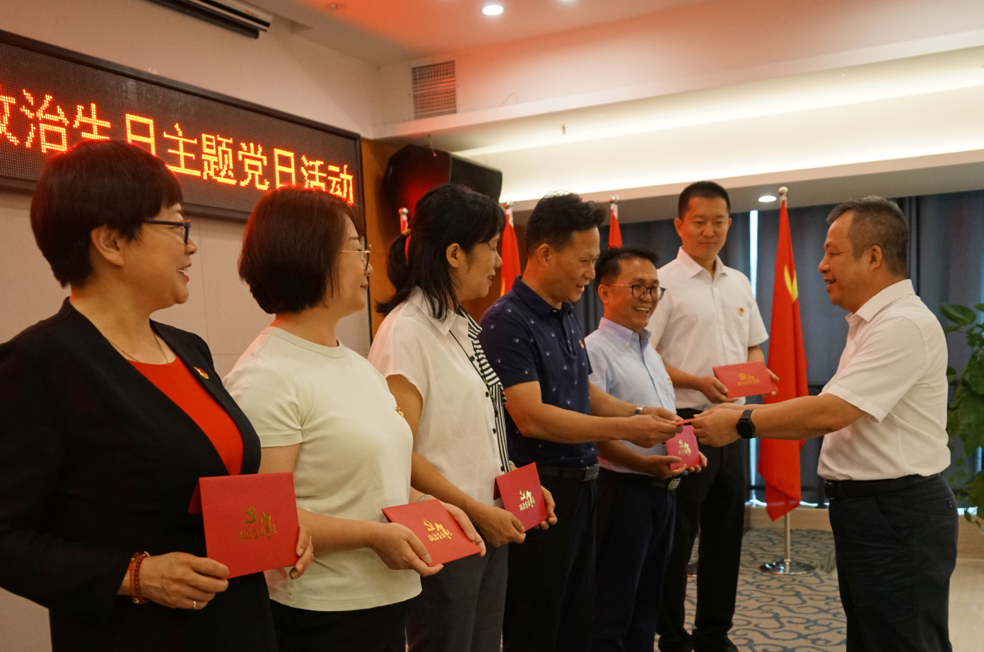 大會(huì)直播結(jié)束后,集團(tuán)黨總支開展“獻(xiàn)禮建黨百年 政治生日憶初心”主題黨日活動(dòng),為所有的黨員慶祝政治生日。自治區(qū)優(yōu)秀黨務(wù)工作者、黨總支書記、董事長、總經(jīng)理周道林向黨總支委員和支部委員贈(zèng)送政治生日卡,第一支部、第二支部書記向其他黨員贈(zèng)送政治生日卡?!斑@是一份沉甸甸的政治生日禮物,是初心,更是責(zé)任”“我會(huì)時(shí)刻牢記共產(chǎn)黨員這一特殊身份”。黨員們在收到政治生日卡時(shí),更多的感受到的是黨員的身份、黨員的榮譽(yù)、黨員的宗旨。