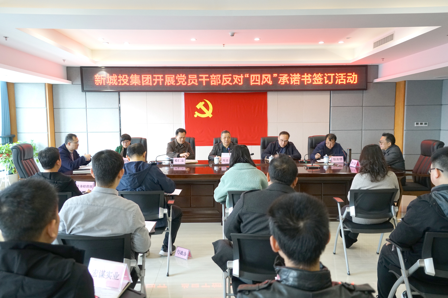 為進一步深入貫徹習近平總書記關于進一步糾治“四風”、加強作風建設的論述,深入開展黨員干部涉酒違紀違法問題專項整治工作,近日,新城投集團組織公司班子成員,各部室、子公司負責人等黨員干部簽訂《黨員干部和公職人員反對“四風”承諾書》,公開承諾帶頭自覺糾正“四風”,持之以恒貫徹落實中央八項規(guī)定及其實施細則精神,主動接受監(jiān)督。集團黨總支書記、董事長周道林主持會議。集團領導班子成員,各部室、子公司負責人參加會議。
