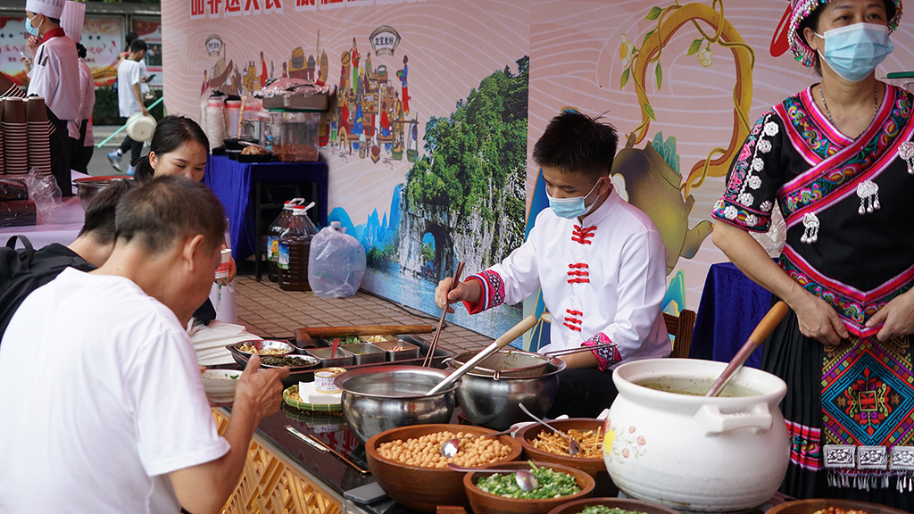 活動現(xiàn)場,“品非遺美食,游桂林山水”的主題引人入勝,桂林米粉、恭城油茶“非遺”文化展示及品嘗等活動精彩紛呈。為確?;顒拥捻樌M行,宏謀酒管公司迅速組織了20名一線工作者,他們不懼烈日高溫,全心全意地投入到工作中。盡管汗水浸透了他們的衣衫,但他們始終保持著飽滿的熱情和專注,為新生們提供了優(yōu)質(zhì)的服務?;顒蝇F(xiàn)場氛圍火爆,總計供應了2000碗米粉以及1500碗油茶,為初來乍到新生和家長們帶來了一場別具特色的美食文化盛宴。