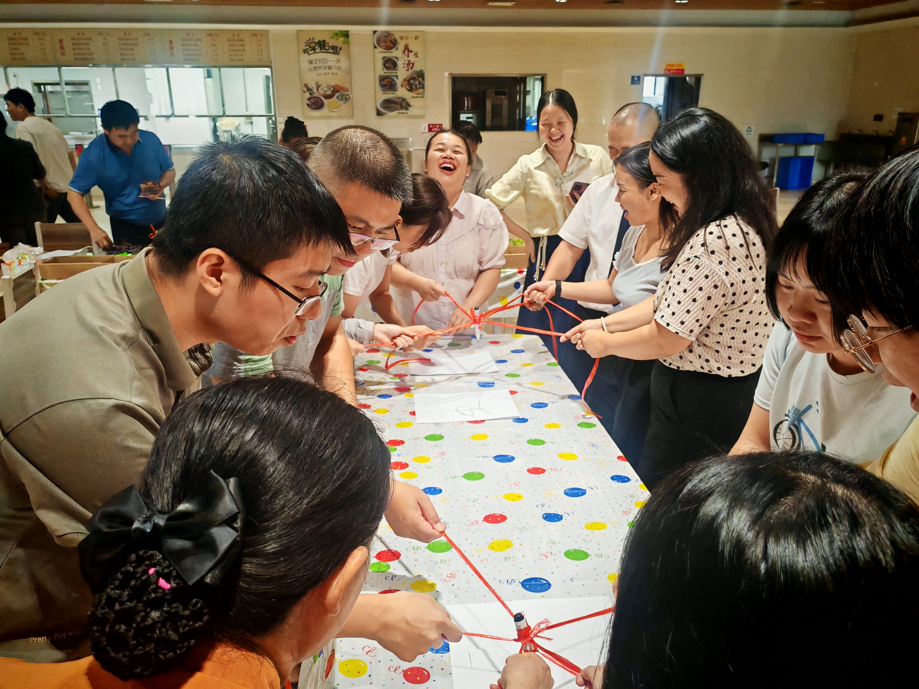 這是最考驗(yàn)團(tuán)隊(duì)協(xié)作的環(huán)節(jié)。六人一組,每人牽一根繩子共同控制筆尖,寫出一行字或畫出圖案??此坪?jiǎn)單,卻讓人手忙腳亂,常常一筆下去就引得全場(chǎng)大笑。但最終,大家齊心協(xié)力完成作品時(shí),也收獲了滿滿成就感。