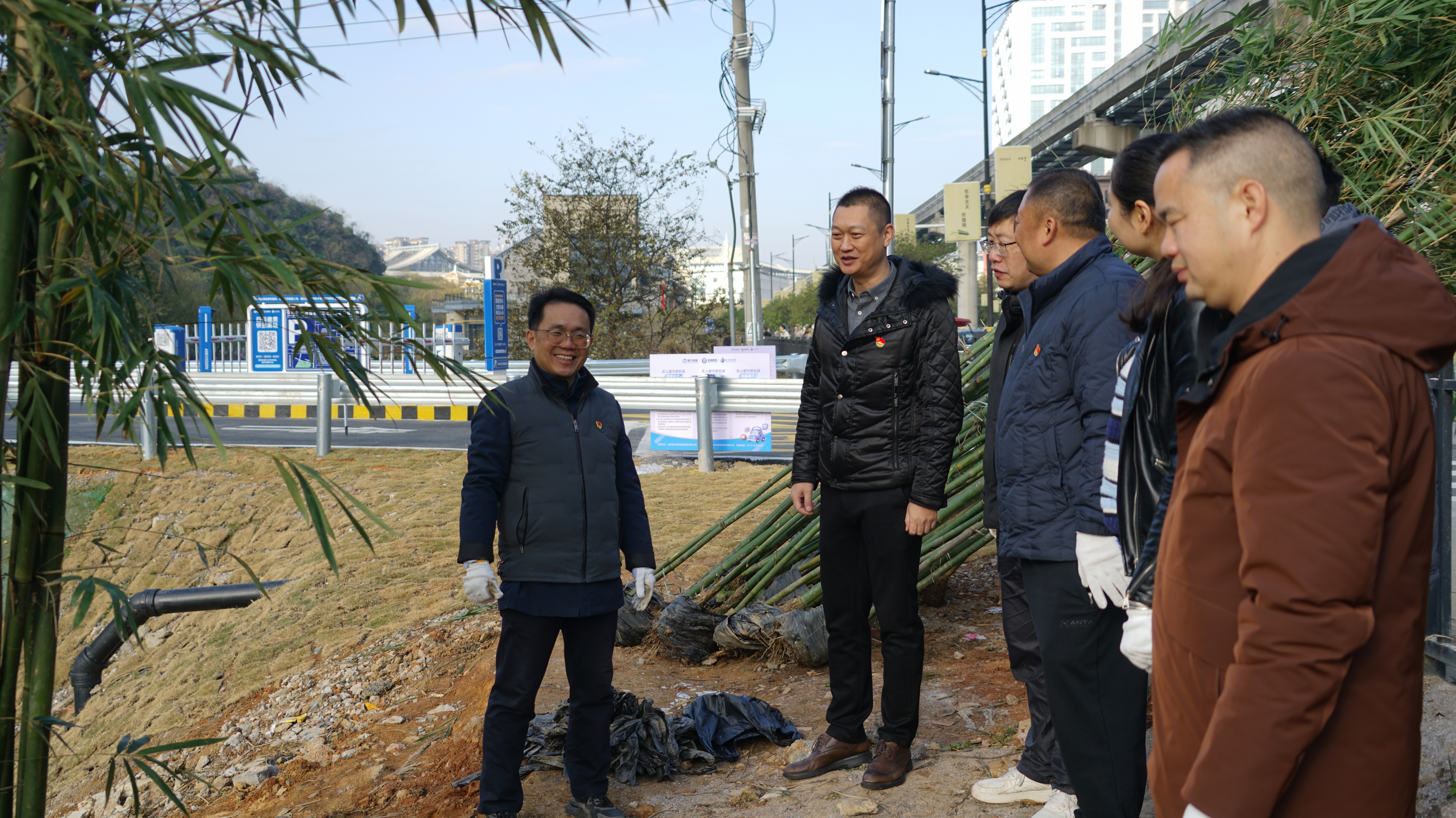 活動當(dāng)天,新城投集團黨委書記、董事長朱毅情系山水公園造景,為市民、游客提供更好的休閑場所,在趕飛機出差前專程前往山水公園山水街人行步道活動現(xiàn)場,看望慰問一線勞動的同志們,為大家加油鼓勁。朱毅書記抵達后,首先仔細察看步道周邊環(huán)境與種竹作業(yè)進展,隨后走進勞動隊伍,與現(xiàn)場人員親切交流,詳細詢問竹苗品種選擇、種植養(yǎng)護要點及后續(xù)步道景觀優(yōu)化規(guī)劃??吹酱蠹曳止び行?、干勁十足,他對同志們的辛勤付出給予充分肯定,強調(diào)“人行步道是服務(wù)群眾出行的‘民生道’,也是展現(xiàn)城市生態(tài)美的‘風(fēng)景線’,此次種竹添綠不僅要栽下‘新綠’,更要栽出‘民心’,切實把實事辦在群眾心坎上”。同時叮囑大家在勞動中注意保暖、保障安全,鼓勵全體黨員持續(xù)發(fā)揮先鋒模范作用,將黨建活力轉(zhuǎn)化為服務(wù)城市建設(shè)、改善民生福祉的實際成效。