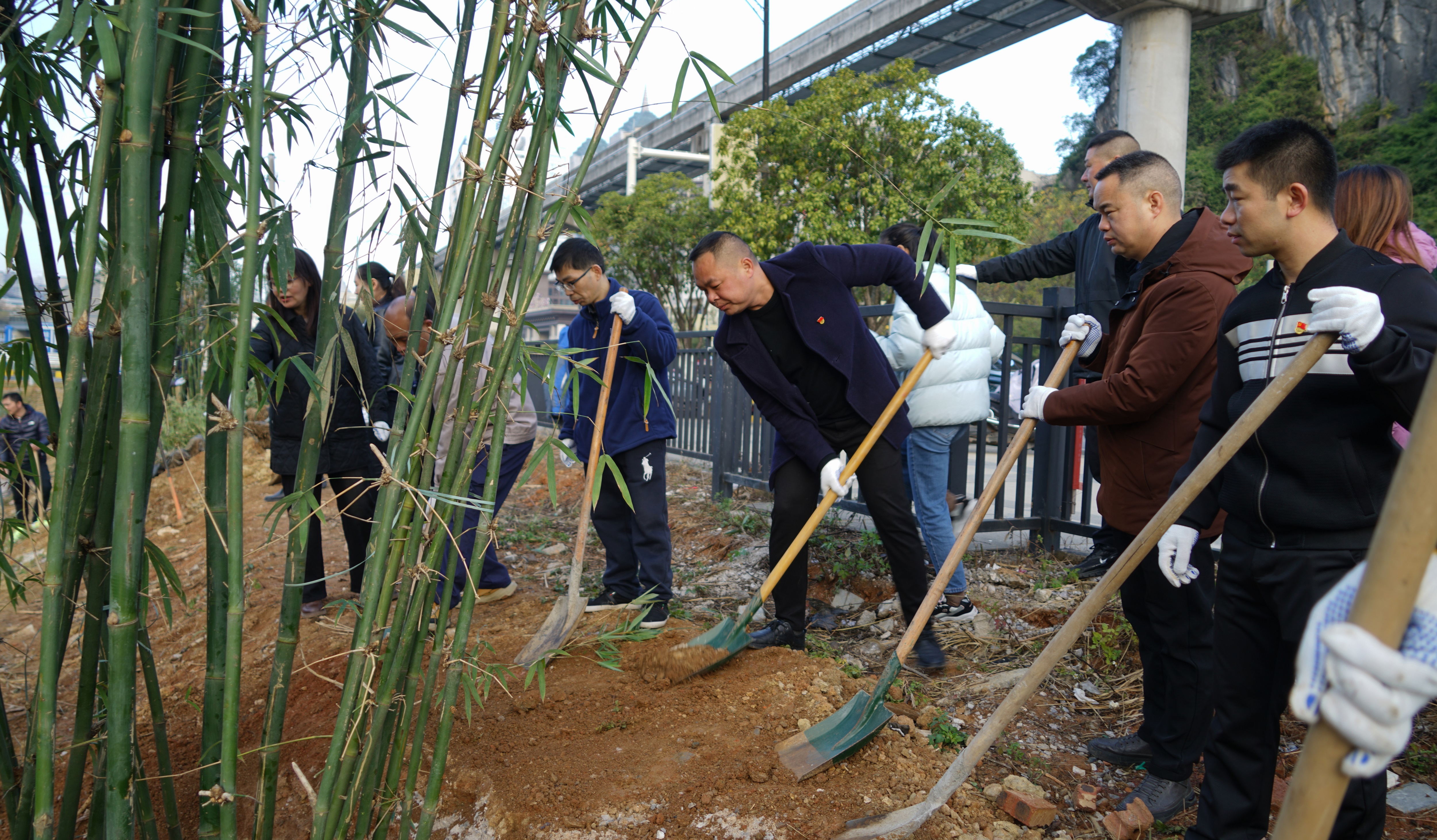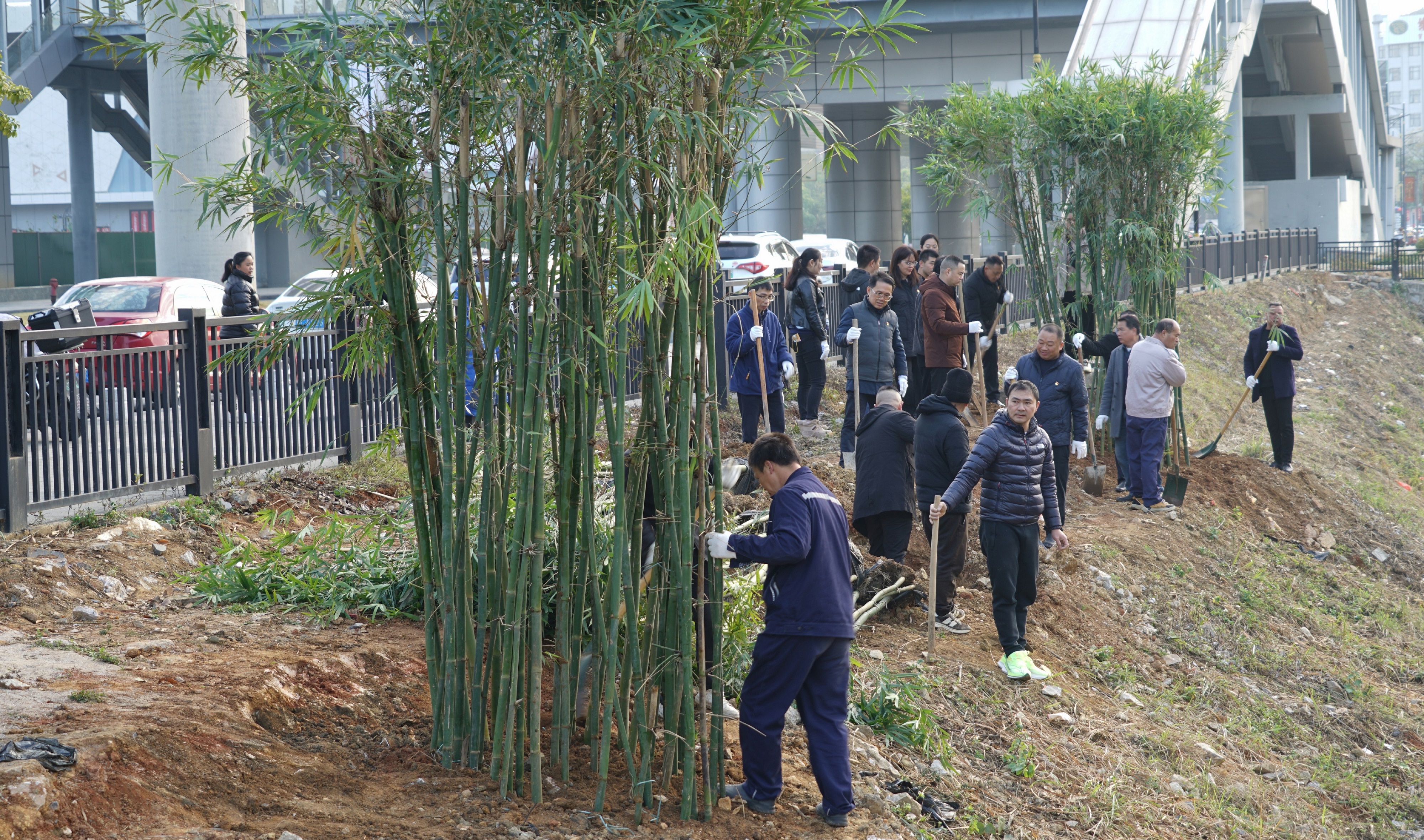隨后,種竹添綠核心環(huán)節(jié)正式啟動,在宏謀城運公司工作人員的專業(yè)指導(dǎo)下,大家迅速分工、默契協(xié)作:有的搬運竹苗、有的揮鍬挖穴、有的扶苗定植、有的培土壓實,每一個動作都認(rèn)真細致、有條不紊。