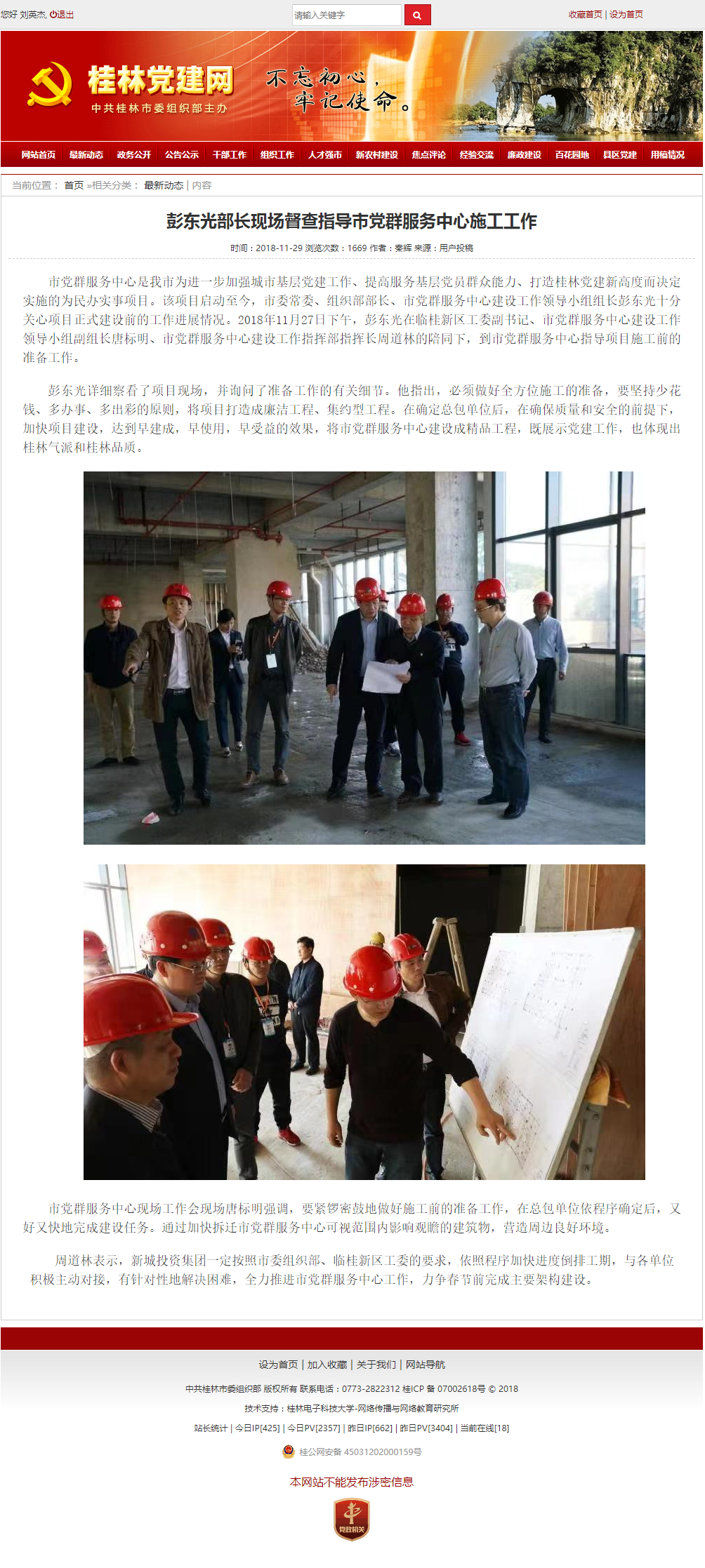 桂林黨建網(wǎng)-彭東光部長現(xiàn)場督查指導(dǎo)市黨群服務(wù)中心施工工作