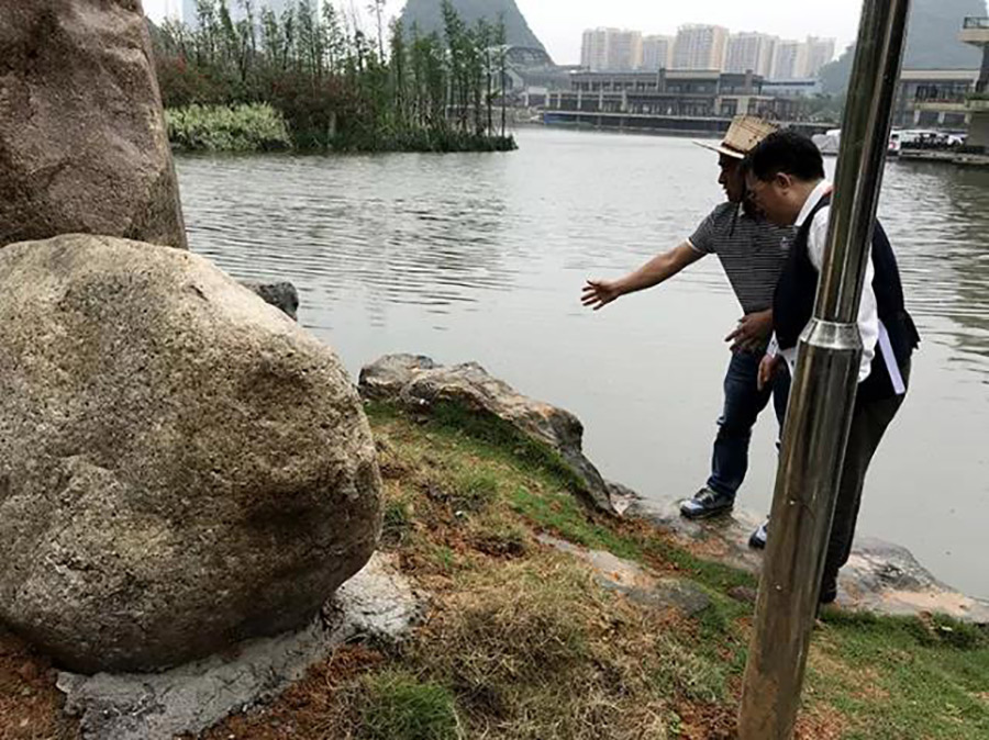 緊接著,檢查組冒雨檢查臨桂新區(qū)橋梁標識石的牢固情況。在現(xiàn)場聽取施工人員的介紹后,檢查組提出進入雨季后,降雨頻繁,要適時加強對橋梁標識石的沉降觀察,以確?;A的安全、穩(wěn)固。