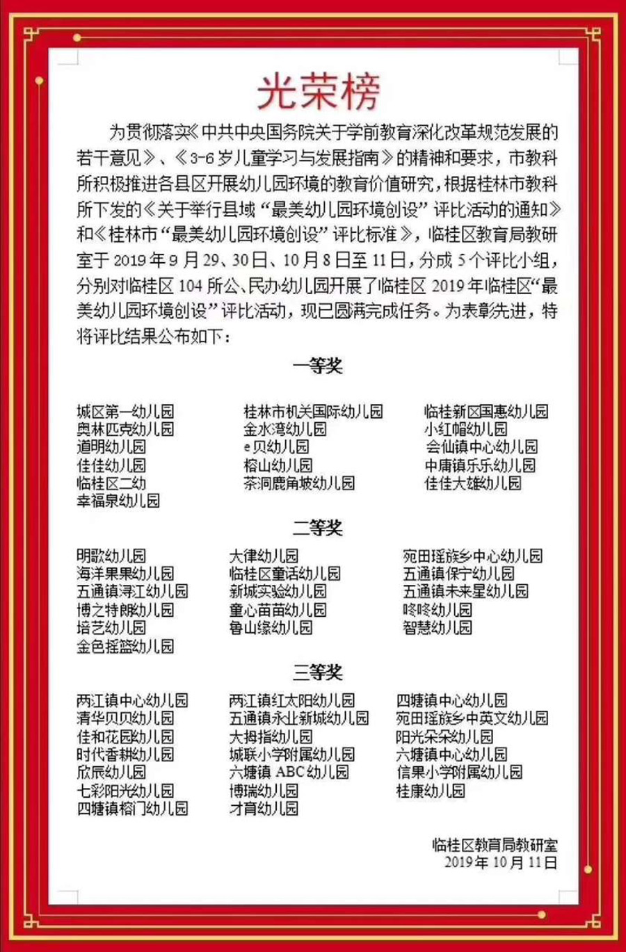 近日,臨桂區(qū)教育局教研室積極推進開展幼兒園環(huán)境的教育價值研究,舉辦了 “最美幼兒園環(huán)境創(chuàng)設”評比活動。國惠幼兒園在評比中榮獲2019年臨桂區(qū)“最美幼兒園環(huán)境創(chuàng)設”一等獎。