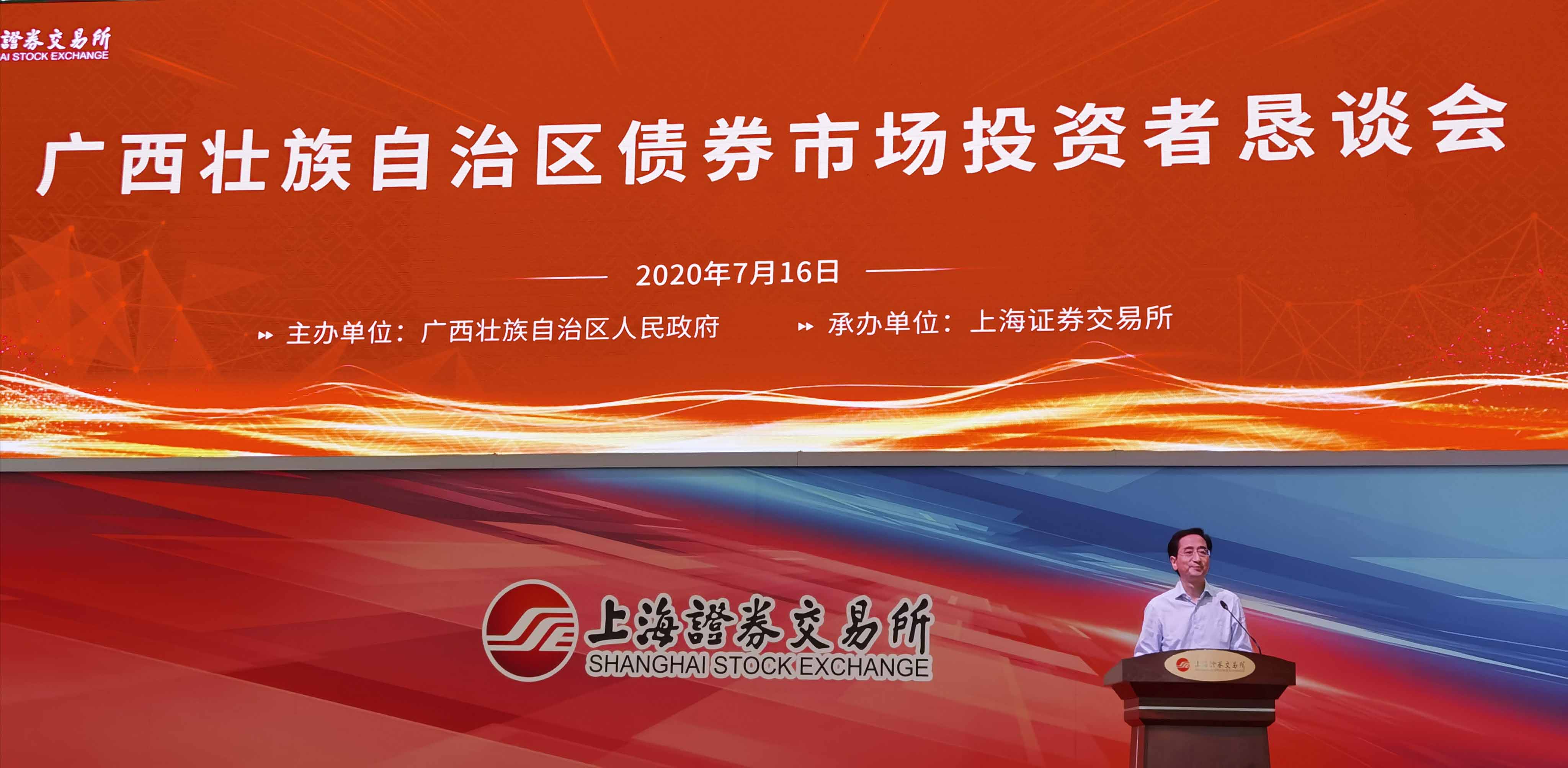 為貫徹落實(shí)《中共中央 國務(wù)院關(guān)于新時(shí)代推進(jìn)西部大開發(fā)形成新格局的指導(dǎo)意見》,提升西部地區(qū)直接融資比例,切實(shí)提升廣西債券融資能力,助推廣西經(jīng)濟(jì)高質(zhì)量發(fā)展,廣西壯族自治區(qū)人民政府于2020年7月16日在上海證券交易所舉辦了廣西壯族自治區(qū)債券市場投資者懇談會。國泰君安證券、申港證券、交通銀行等國內(nèi)30余家金融機(jī)構(gòu)代表及廣西投資集團(tuán)、北部灣投資集團(tuán)、廣西物質(zhì)集團(tuán)、柳州東城集團(tuán)等20余家廣西區(qū)內(nèi)大型知名企業(yè)參加了本次懇談會。上海證券交易所黨委書記、理事長黃紅元(副部長級)出席會議,上海證券交易所副副總經(jīng)理劉紹統(tǒng)、廣西區(qū)人大常委會副主任張曉欽先后致辭發(fā)言,廣西金融監(jiān)管局、廣西財(cái)政廳負(fù)責(zé)人介紹了廣西債券發(fā)行工作情況。