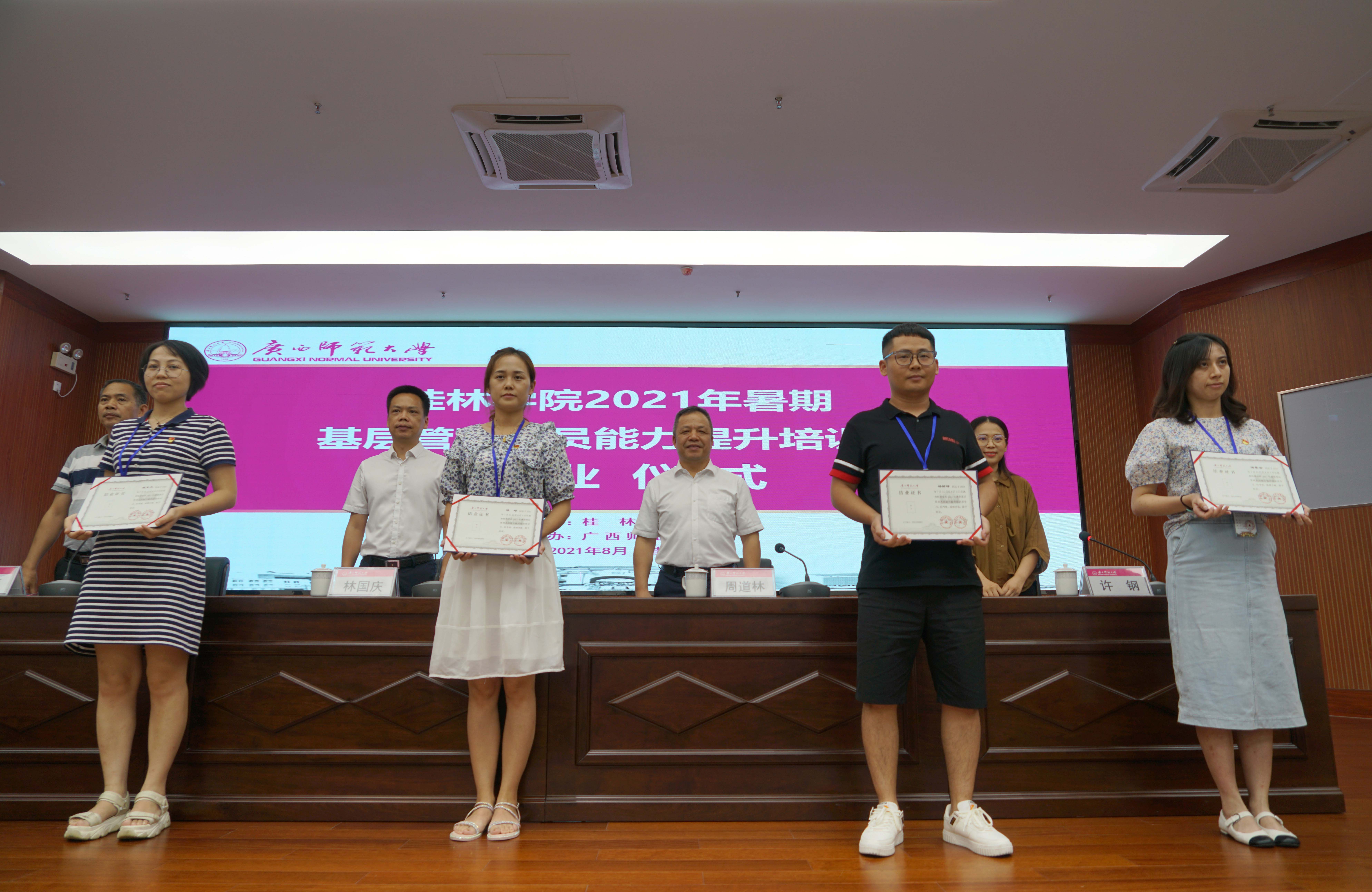 8月2日下午,桂林學院基層管理人員能力提升培訓班結業(yè)儀式在廣西師范大學育才校區(qū)國際教育交流中心報告廳舉行,共有來自桂林學院的98名基層管理人員參加了這次為期三天的培訓。廣西師范大學黨委常委、組織部部長林國慶,桂林新城投資集團黨總支書記、董事長、總經(jīng)理、桂林學院董事長周道林,桂林學院校長楊樹喆等出席結業(yè)儀式。廣西師范大學干部教育培訓學院辦公室主任許鋼主持結業(yè)儀式。