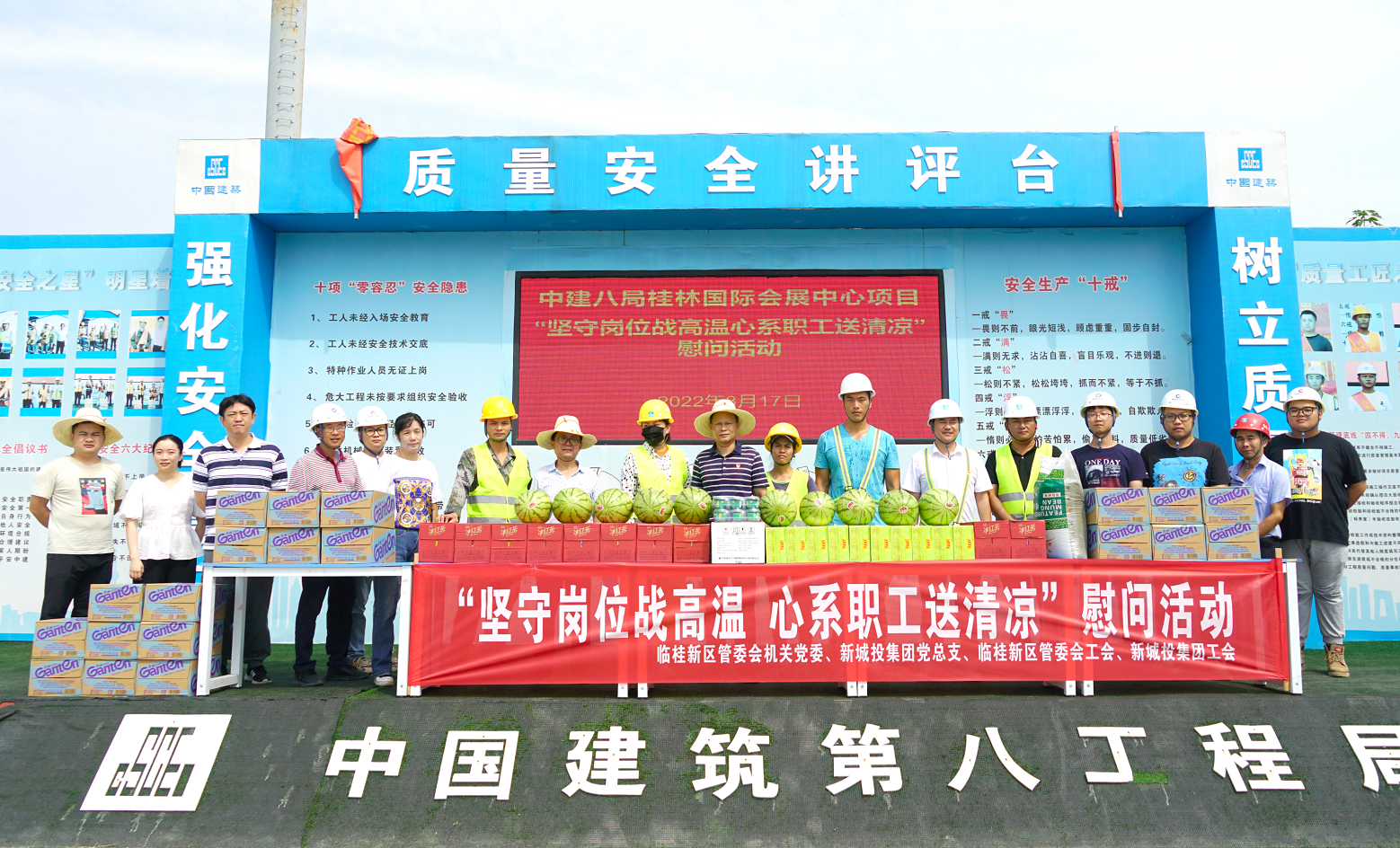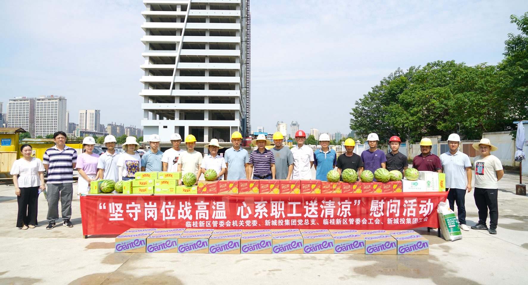 入伏以來(lái),我市驕陽(yáng)似火,高溫難耐。為切實(shí)做好桂林新區(qū)重點(diǎn)項(xiàng)目建設(shè)者的防暑降溫工作,保障建設(shè)者安全度伏,促進(jìn)重大項(xiàng)目安全生產(chǎn),2022年8月17日,一場(chǎng)由臨桂新區(qū)管委會(huì)機(jī)關(guān)黨委和新城投集團(tuán)黨總支主辦,新區(qū)管委會(huì)工會(huì)和新城投集團(tuán)工會(huì)承辦的“堅(jiān)守崗位戰(zhàn)高溫,心系職工送清涼”慰問活動(dòng)依次在北區(qū)湖塘水系連通工程項(xiàng)目、國(guó)際會(huì)展中心項(xiàng)目、興桂園項(xiàng)目建設(shè)一線開展。