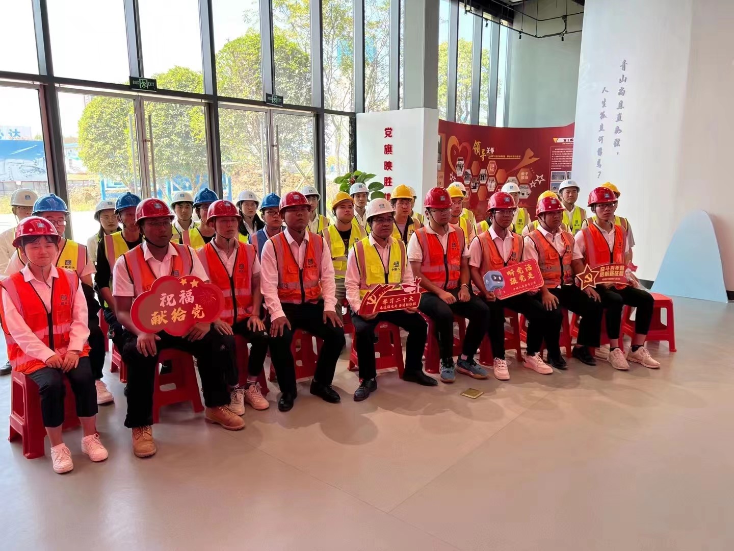集團(tuán)辦公區(qū)、項(xiàng)目現(xiàn)場(chǎng)宣傳欄等位置張貼圖文、制作展板,利用電子屏滾動(dòng)播放知識(shí)要點(diǎn)、宣傳標(biāo)語(yǔ)、回放大會(huì)報(bào)告視頻,廣泛宣傳黨的二十大精神,構(gòu)筑起一道道亮麗的“紅色風(fēng)景線(xiàn)”,打造宣傳新陣地。