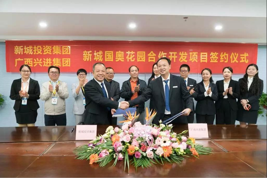 10月11日,桂林新城投資開發(fā)集團(tuán)有限公司與廣西興進(jìn)實(shí)業(yè)集團(tuán)有限責(zé)任公司在新城投資集團(tuán)15樓會(huì)議室舉行新城國奧花園合作開發(fā)項(xiàng)目簽約儀式。桂林市臨桂新區(qū)管委會(huì)副主任覃正東出席并見證簽約,桂林新城投資開發(fā)集團(tuán)有限公司總裁周道林,廣西興進(jìn)實(shí)業(yè)集團(tuán)有限責(zé)任公司董事長羅欣分別代表雙方在合作協(xié)議書上簽字。