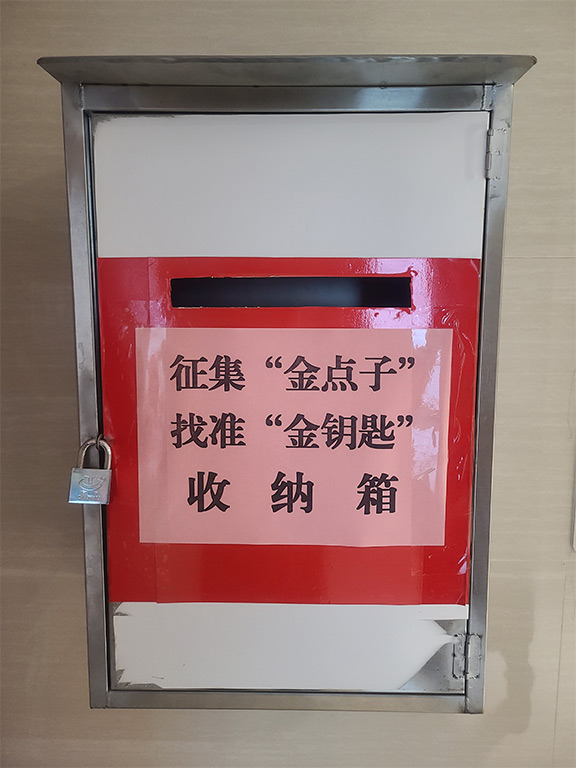在公司15樓設(shè)置征集“金點(diǎn)子”找準(zhǔn)“金鑰匙”收納箱,直接由總經(jīng)理開(kāi)取收納箱??偨?jīng)理將根據(jù)方案的可行性安排時(shí)間與提出方案的個(gè)人及團(tuán)隊(duì)見(jiàn)面,聽(tīng)取方案介紹,探討落實(shí)對(duì)策。