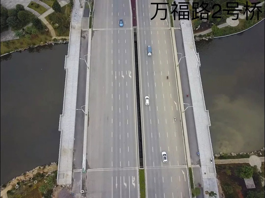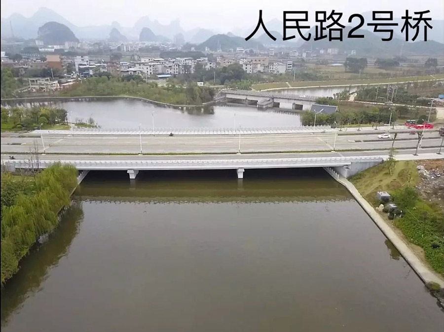 人民路二號橋位于臨桂新區(qū)人民路(萬福路-臨雁路段)上,是臨桂區(qū)通往秧塘工業(yè)園區(qū)的重要通道,橋梁結(jié)構(gòu)采用32米+32米+32米三跨等截面連續(xù)結(jié)構(gòu),跨越臨桂新區(qū)規(guī)劃水系,橋梁中心線與河道正交,橋梁長度為102.2米、寬度為40米,該工程于2017年5月開工建設(shè),于2018年6月21日完成初步驗(yàn)收。