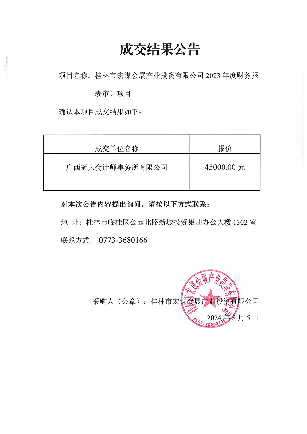 桂林市宏謀會展產(chǎn)業(yè)投資有限公司?2023年度財務(wù)報表審計項(xiàng)目成交結(jié)果公告