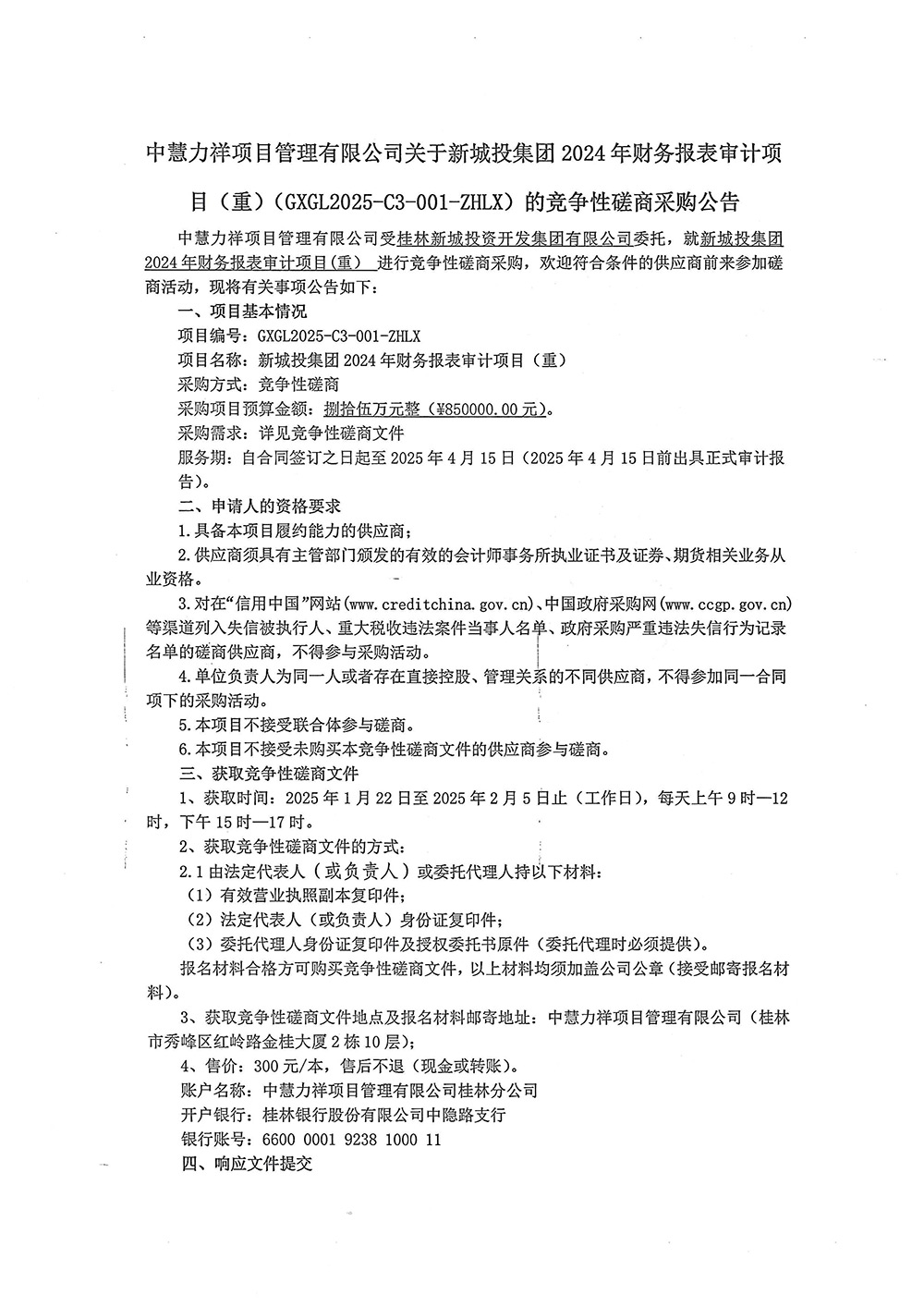 中慧力祥項(xiàng)目管理有限公司關(guān)于新城投集團(tuán)2024年財(cái)務(wù)報(bào)表審計(jì)項(xiàng)目(重)(GXGL2025-C3-001-ZHLX)的競爭性磋商采購公告