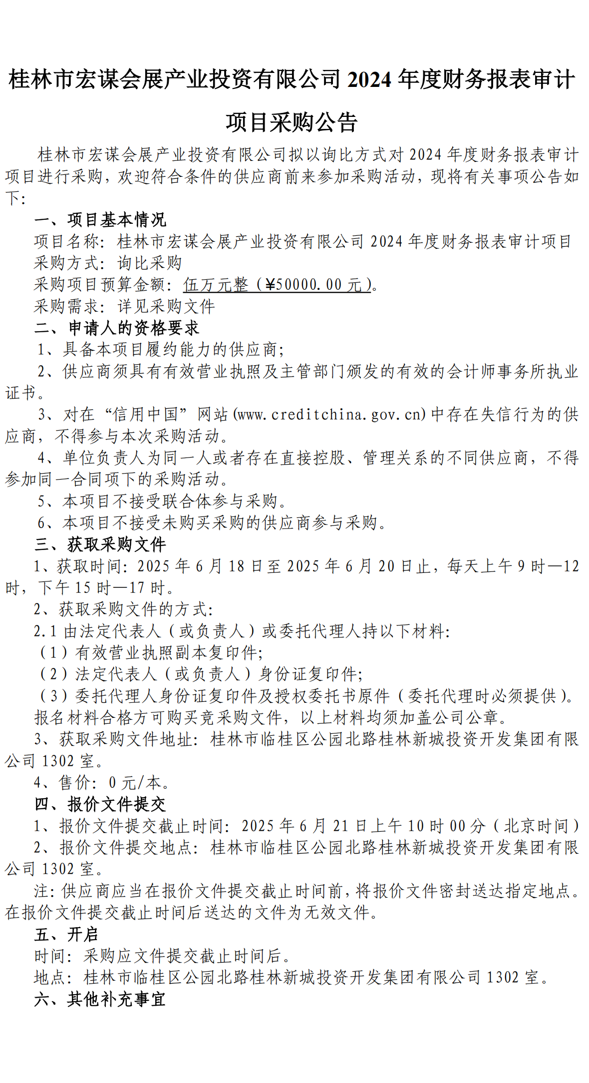 桂林市宏謀會展產(chǎn)業(yè)投資有限公司2024年度財務報表審計項目采購公告