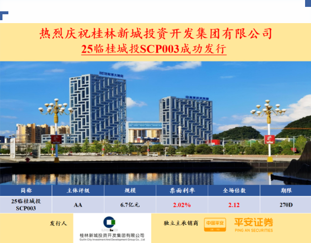8月6日,桂林新城投資開發(fā)集團有限公司成功發(fā)行2025年度第三期超短期融資券,規(guī)模6.7億元,票面利率2.02%,認(rèn)購倍數(shù)2.12倍,本期超短融由平安證券獨立承銷。此次成功發(fā)行超短融利率僅次于2025年度第二期超短融創(chuàng)下的“桂林市有史以來信用債發(fā)行的最低利率2.01%”!