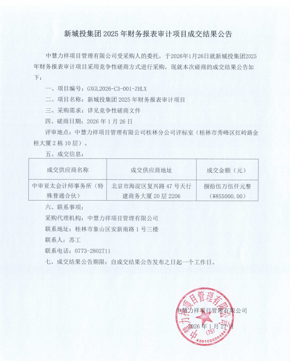 新城投集團2025年財務報表審計項目成交結果公告