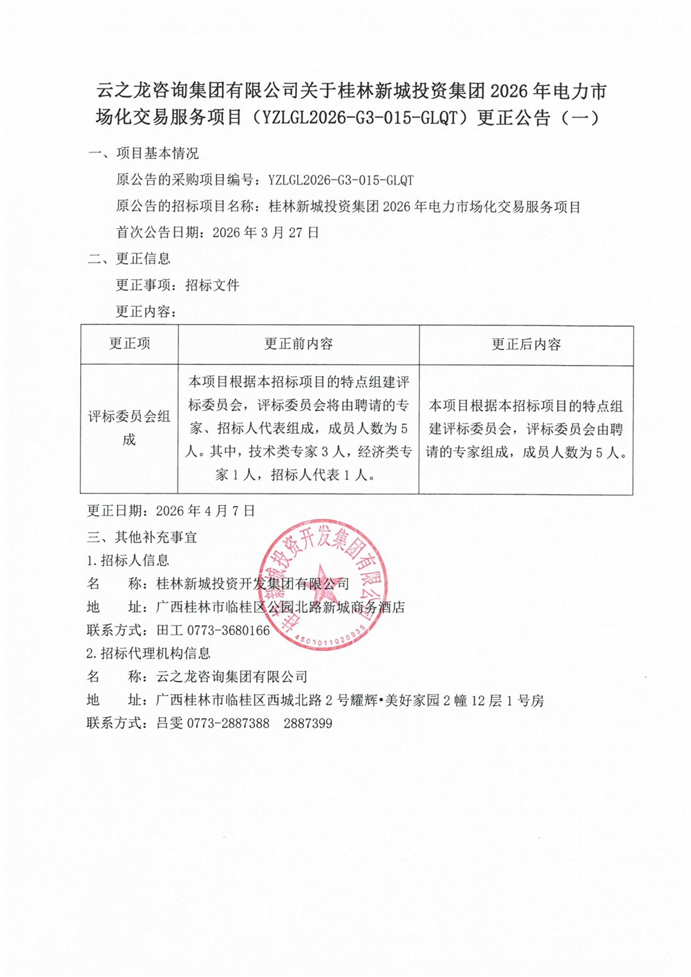 云之龍咨詢集團(tuán)有限公司關(guān)于桂林新城投資集團(tuán) 2026 年電力市場化交易服務(wù)項(xiàng)目 (YZLGL2026-G3-015-GLQT) 更正公告(一)